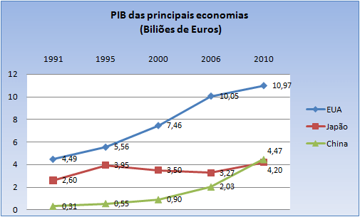Com uma evolução de 10,3% do PIB em 2010, a China desalojou o Japão do 2.º lugar da economia mundial – 4,47 biliões de euros é o valor atingido pela economia chinesa, contra os 4,20 biliões do Japão (3,9% de crescimento). Na frente, continuam os EUA com 10,97 biliões.