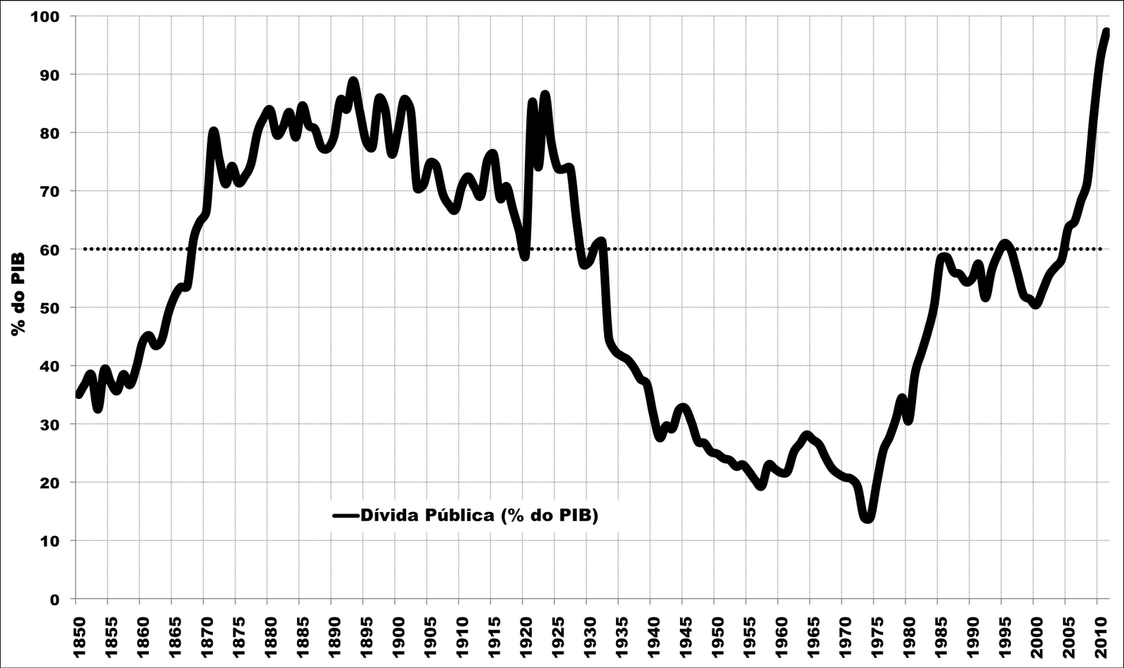 Dívida Pública em percentagem do PIB 1850-2011 – Gráfico parte do livro “Portugal na Hora da Verdade”, de Álvaro Santos Pereira, a sair dentro de duas semanas.