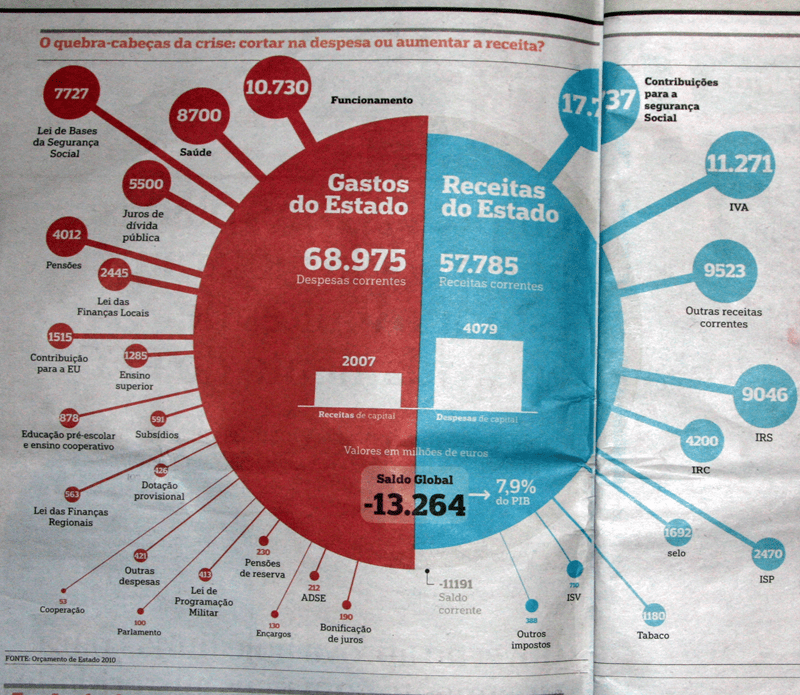 No gráfico mais à esquerda, saído ontem no Público, podemos ver (clicar para ampliar) que a maior das despesas do Estado consiste em cobrar os impostos (finanças) e administra-los (administração pública). Uma despesa muito superior aos gastos com a saúde ou com a segurança social ou com a educação. E sete vezes maior do que os gastos na justiça.